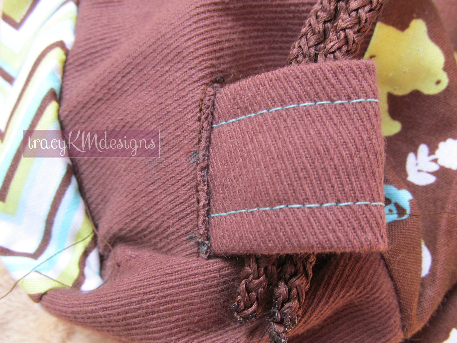 After much thinking, I looked at my kids' cheapy cinch sacks, and some of them used loops sewn into the side seams, and the cords come through the loop and knotted below. I've had to replace a few of these loops. Again, I had no seam to sew the ends of the loop through, and if I placed the loop on the outside with each side spread and sewn down (picture the breast cancer ribbon, put fold each leg out flat to the side), you'd see the ends of the loop and how to make that look finished? I could put the loop through the buttonhole, and stitch down the ends...again, the stitching would show but maybe I could do it really close to the buttonhole.